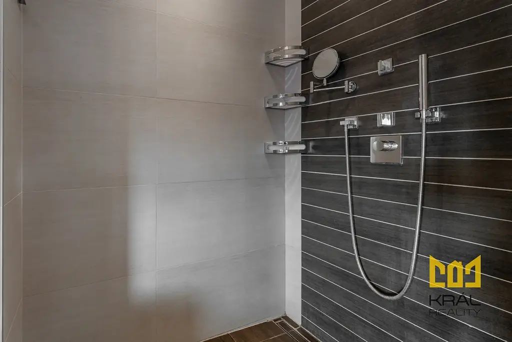 Samostatný dětský pokoj. Součástí bytu je na míru vyrobená šatna, která se nachází ihned v zádveří. Na podlahách jsou masivní dřevěné dubové parkety a italská dlažba. V celém bytě je alarm, bezpečnostní a protipožární dveře Sapeli, vytápění podlahové plynovým kotlem, který je umístěn v koupelně. Klimatizace LG v celé bytové jednotce.