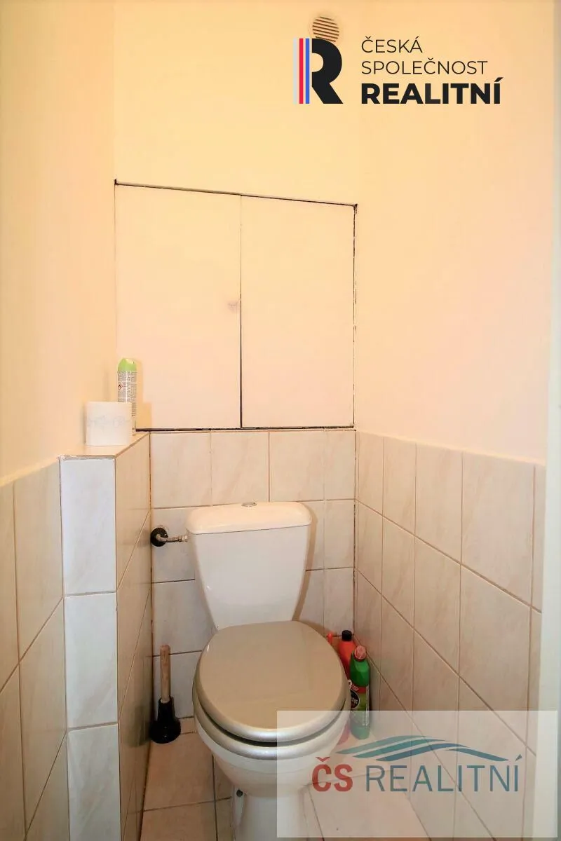 WC je samostatné, koupelna zděná s vanou, zrcadlem a skříňkou pod umyvadlem.