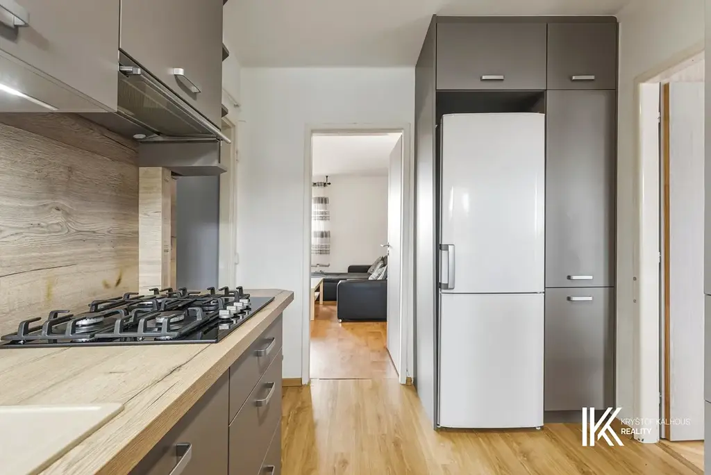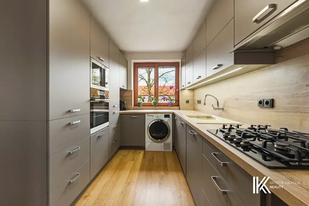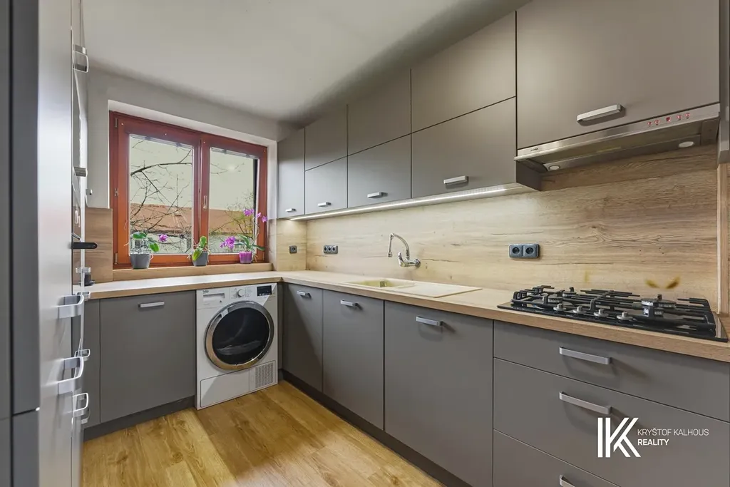 Srdcem bytu je severozápadně orientovaná kuchyně, která je umístěna centrálně a přirozeně propojuje celý prostor. Kuchyňská linka do tvaru L nabízí velkorysou pracovní plochu i množství úložných skříněk a je vybavena vestavěnými spotřebiči včetně trouby, mikrovlnky, plynového sporáku a myčky. Nechybí ani místo pro pračku nebo sušičku. Je to prostor, kde se bude odehrávat každodenní život – od rychlých snídaní po víkendové vaření.