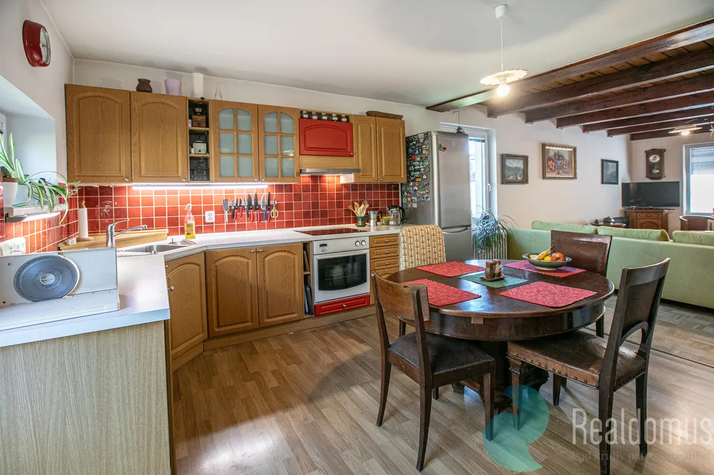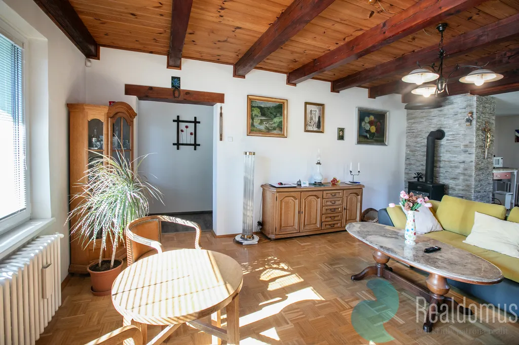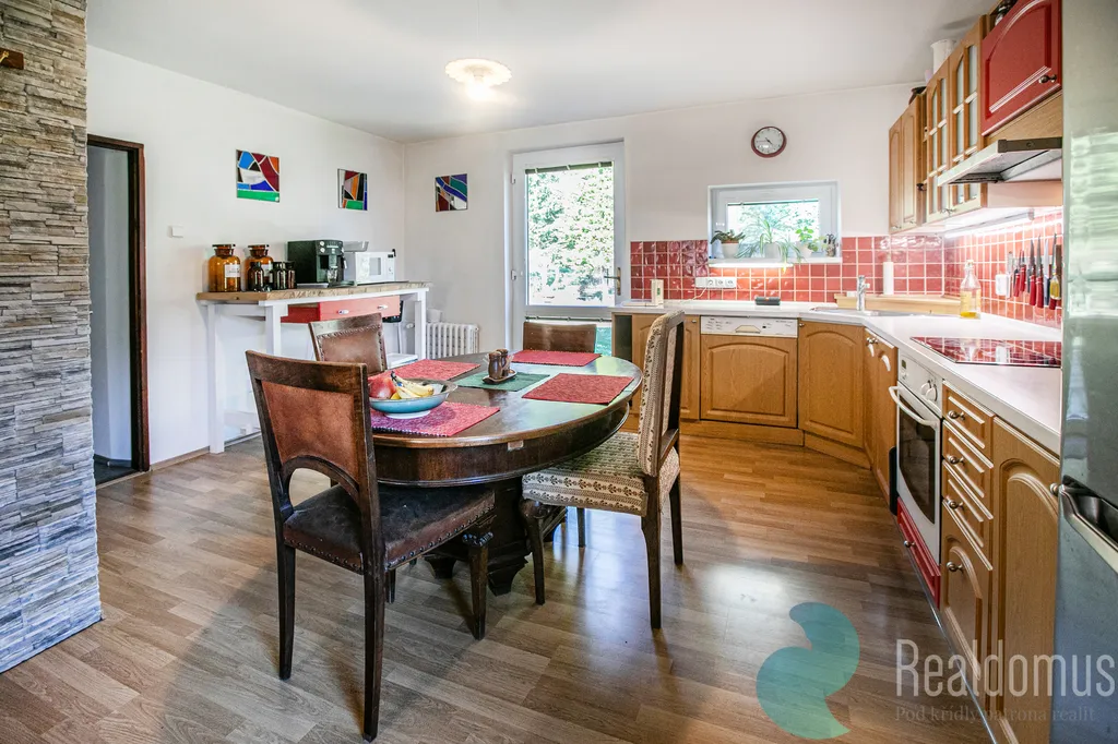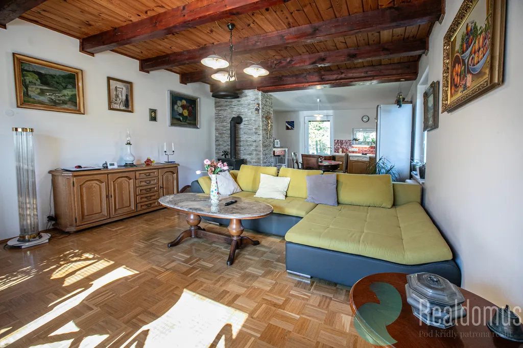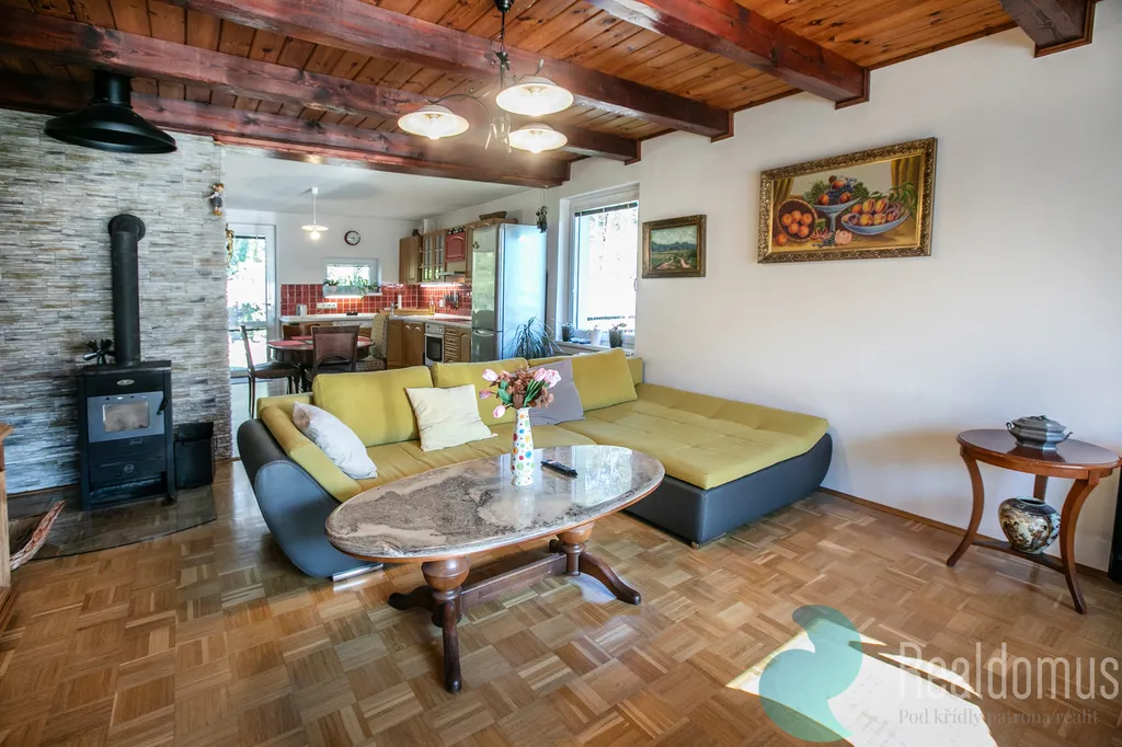 Dominantou je světlý obývací pokoj s kuchyní orientovaný na západ, kde krbová kamna vytváří útulné teplo domova. Z kuchyně vstoupíte přímo na zahradu s výhledem do přilehlého lesa – ideální místo pro ranní kávu i večerní relax, kde můžete v klidu pozorovat lesní zvěř.