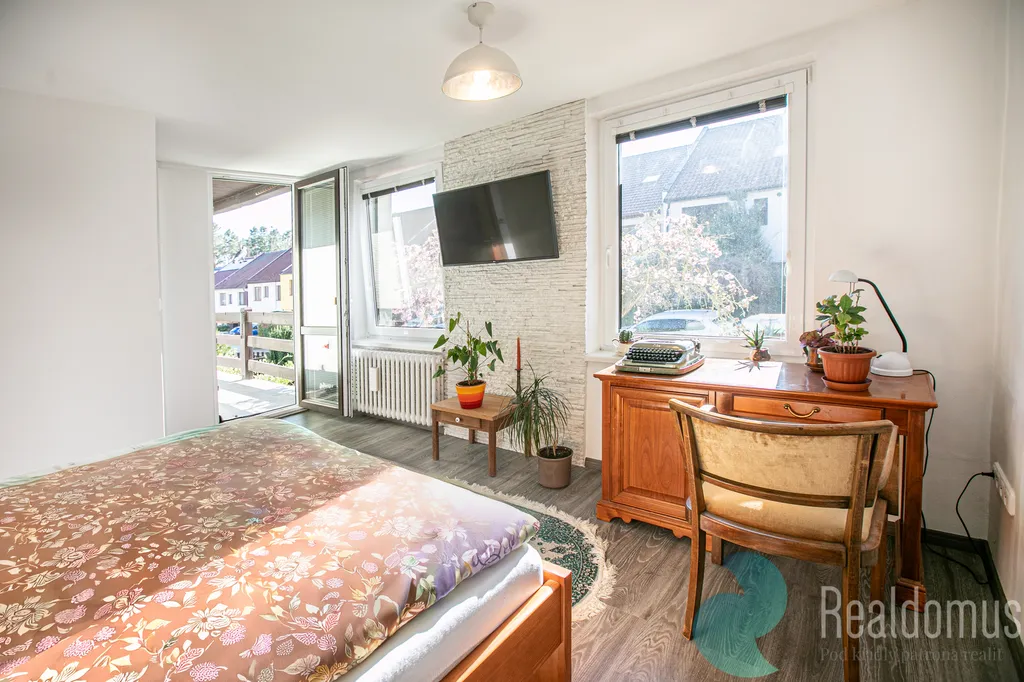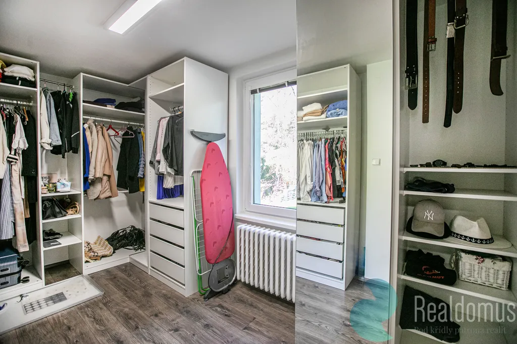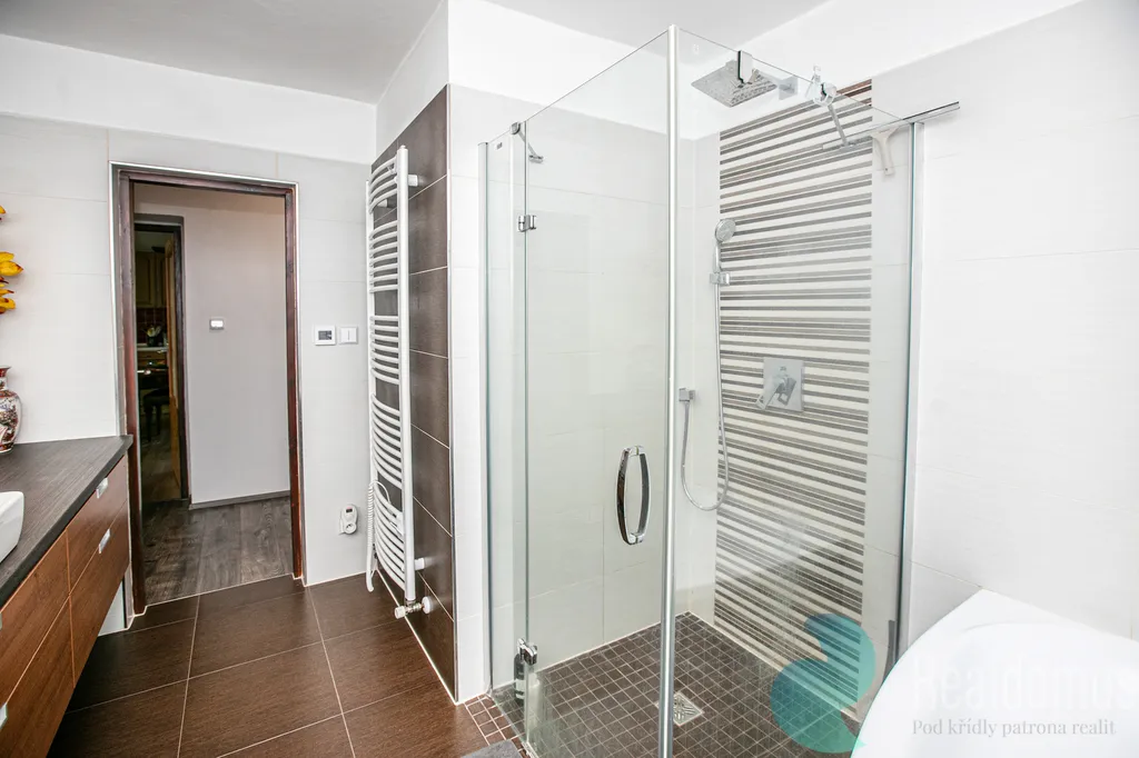 Praktická velká šatna nabízí možnost přestavby na další pokoj. Ložnice s lodžií opět směřuje na západ. Nechybí prostorná koupelna s vanou i sprchovým koutem, dvěma umyvadly a samostatné WC. Z chodby je vstup do sklepa s dvougaráží a technickým zázemím včetně prádelny. A parkovací stání před garáží na svém pozemku.