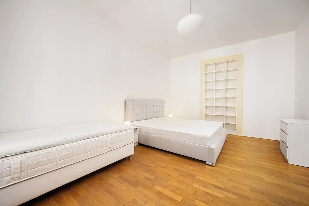 • Ložnice: Velkorysý pokoj orientovaný do ulice, vybavený manželskou postelí, nočními stolky, lampičkami, samostatným lůžkem a křeslem. Součástí je vestavěná šatní nika. Prostor umožňuje i pracovní využití.