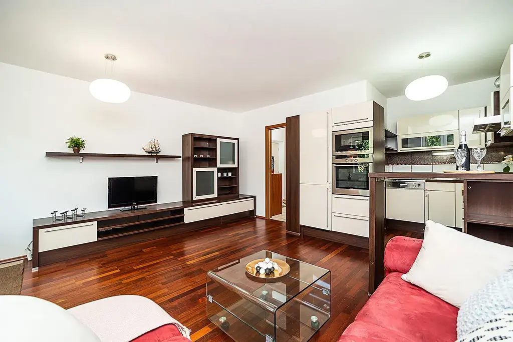 V bytě je kompletně zařízená, opravdu velká kuchyňská linka se všemi spotřebiči. I jinak je byt zcela zařízený nábytkem, který můžete vidět na fotografiích. Pouze gauč je nyní jiný. V ložnici je manželské dvoulůžko a šatní skříň.