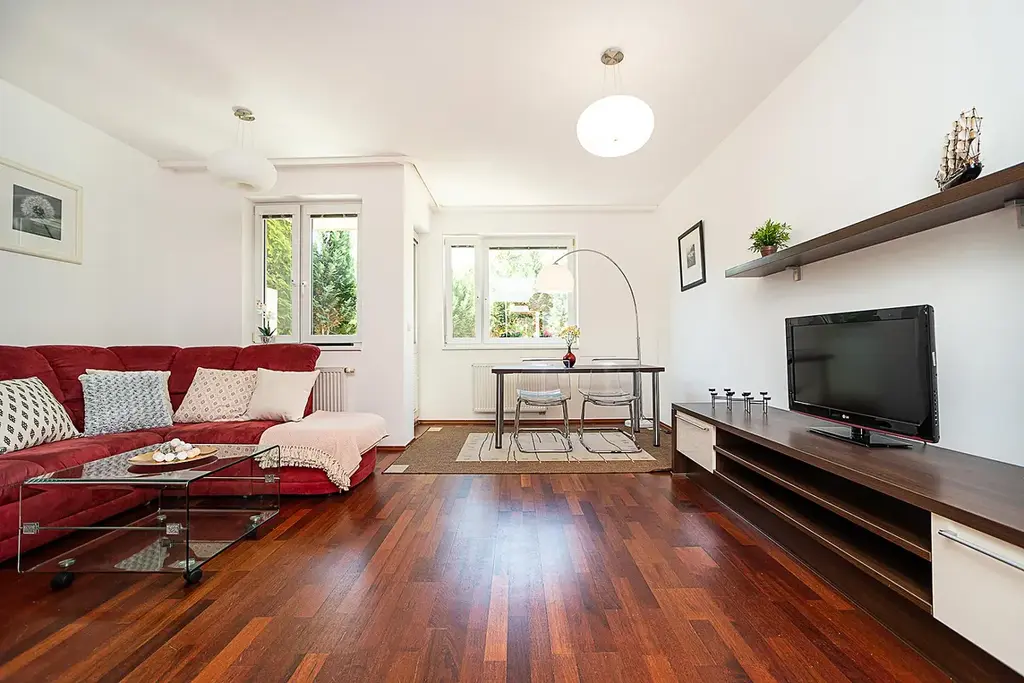 Východ na předzahrádku s malou teráskou je z obývacího pokoje a je směrován na západ. Na druhou terasu, která je orientována do vnitrobloku se dostanete z ložnice.
