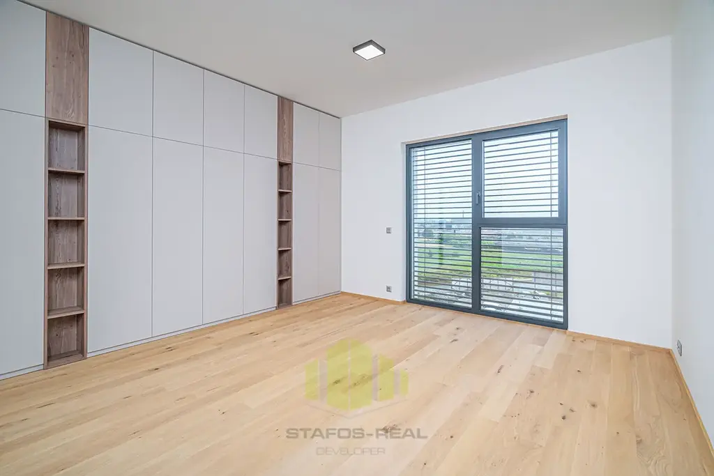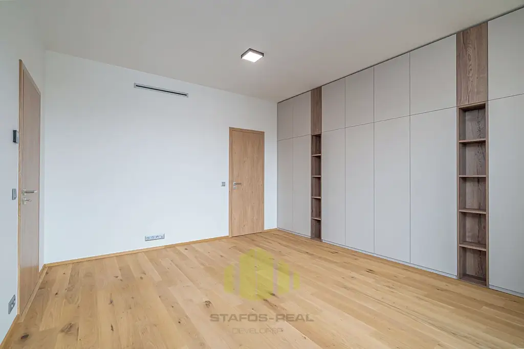 Byt, orientovaný na tři světové strany (Jih, Západ, Sever) nabízí úžasné panoramatické výhledy, a to hned ze dvou venkovních částí bytu - terasy o ploše 18m2 přístupné z obývacího pokoje, tak i lodžie o ploše 5,7m2 s posuvnými paravány přístupné z jedné z ložnic. Při vstupu do bytu je v zádveří umístěn botník s věšáky a šatní skříní, po pravé straně předsíně je k dispozici toaleta s malým umyvadlem, ložnice, dále ložnice s vestavěnou skříní a vstupem na lodžii. Z levé strany je pak umístěna technická místnost s rekuperační jednotkou, servisní skříňkou od podlahového topení a přípravou na pračku se sušičkou, dále koupelna s dvojumyvadlem, vanou a otopným žebříkem. Na konci chodby pak vcházíme do obývacího pokoje s kuchyňskou částí do tvaru L se vstupem na terasu. Obývací pokoj je průchozí do manželské ložnice s vestavěnou skříní a privátní koupelnou se sprchovým koutem, umyvadlem a toaletou.