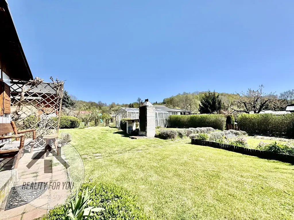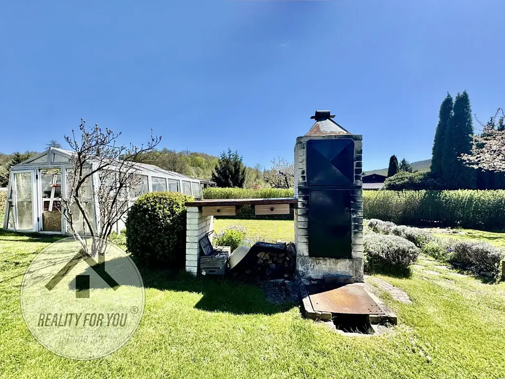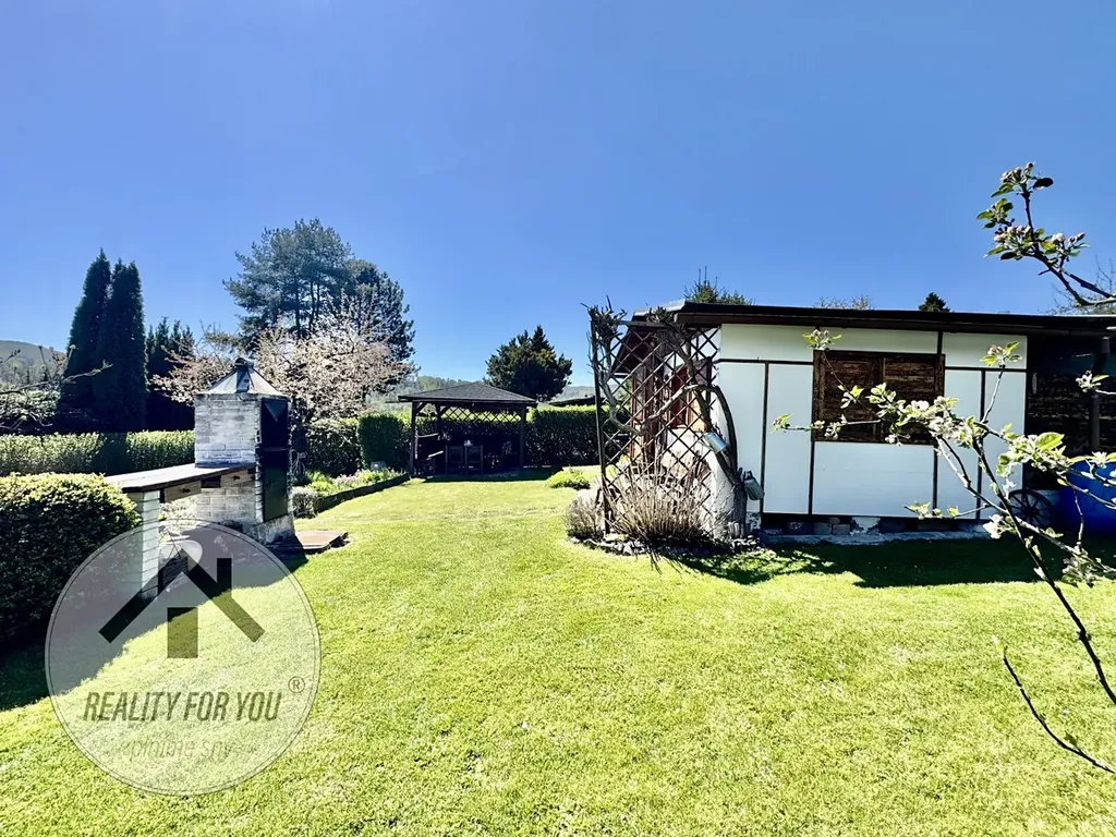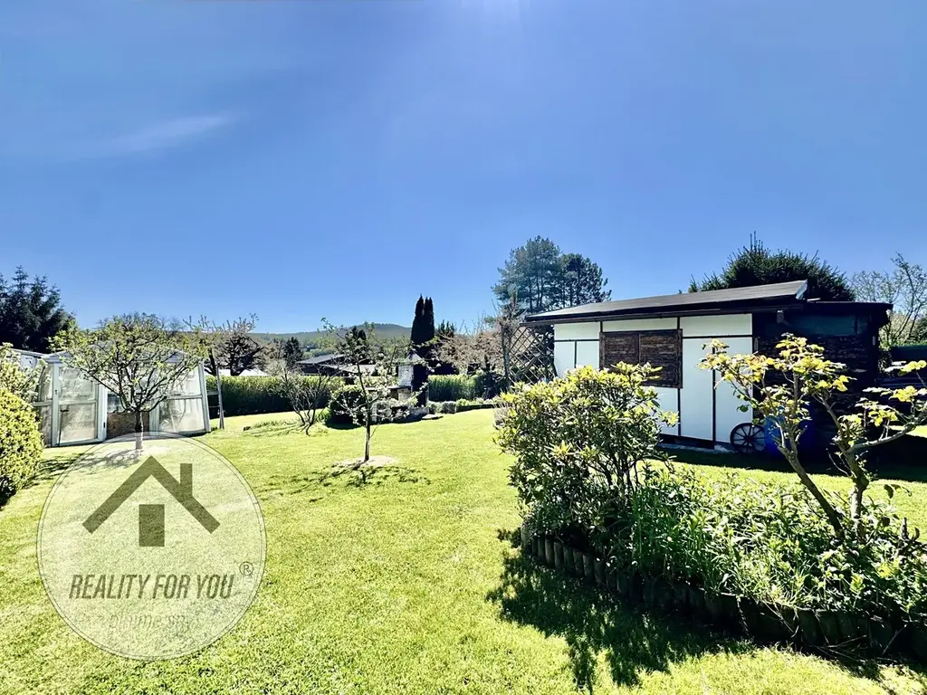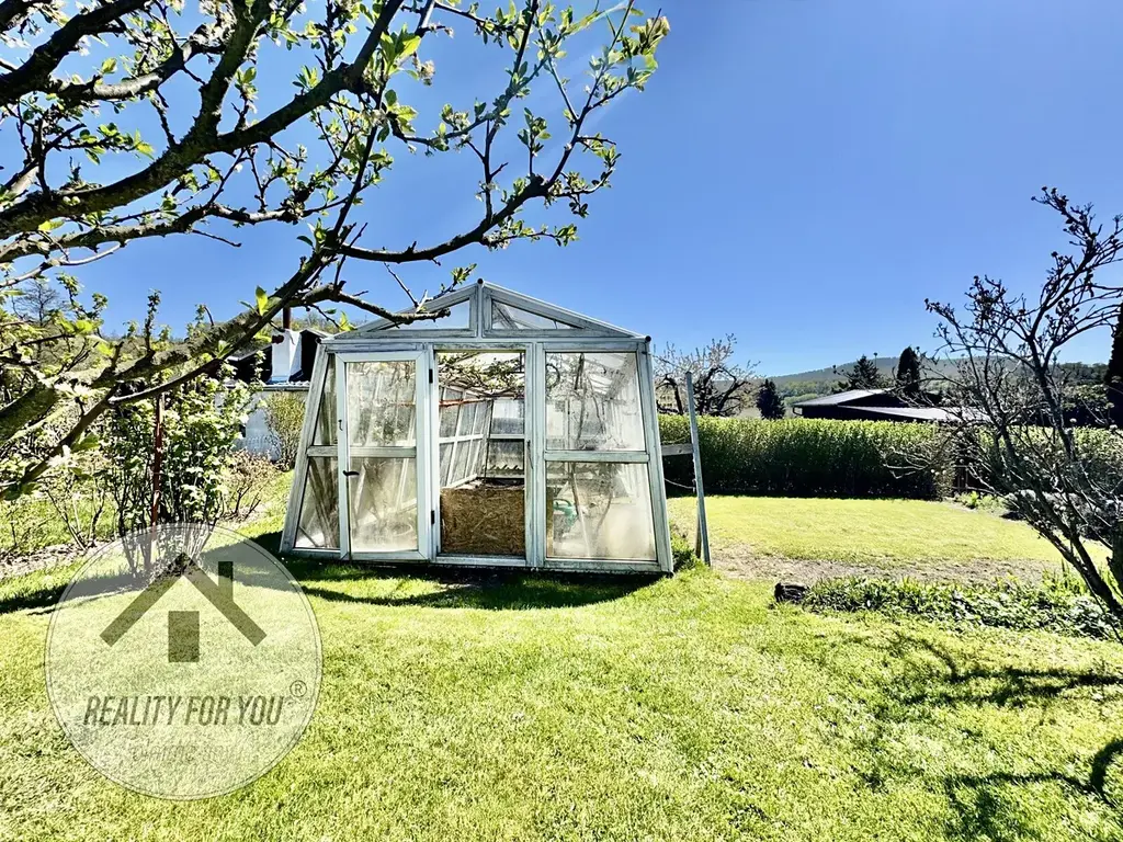 Na pozemku je pergola s posezením s příjemným výhledem a hlavně soukromím. Na zahrádce najdeme skleník, udírnu, ovocné stromy: jabloň, třešeň a švestku, a dále rybíz, angrešt nebo vinnou révu.