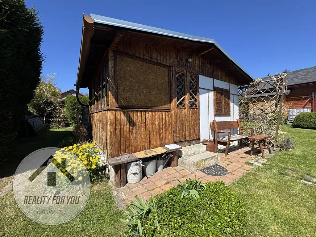 V horní centrální části je umístěna dřevěná zahradní chatka, která je ve skvělé kondici. Chatka má samostatnou ložnici a obytnou část. Chatička nabízí příjemné zázemí pro trávení volného času a možnost přespání. Zavedený elektrický proud je samozřejmostí. V zadní části je menší kůlna a suchá toaleta.