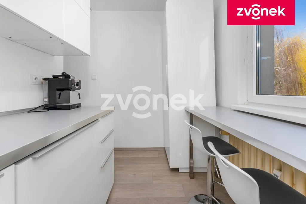 Kuchyně – nová kuchyňská linka v moderním designu s vestavěnými spotřebiči (plynový vařič, trouba, digestoř, myčka, lednice s mrazákem). Příjemným prvkem je barový pult podél okna s elegantními barovými židličkami.