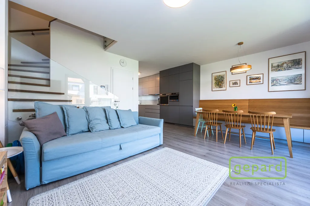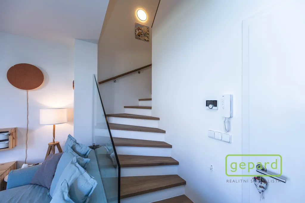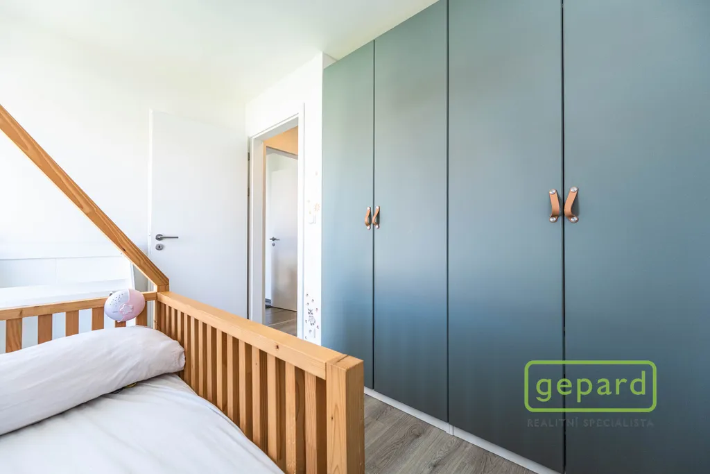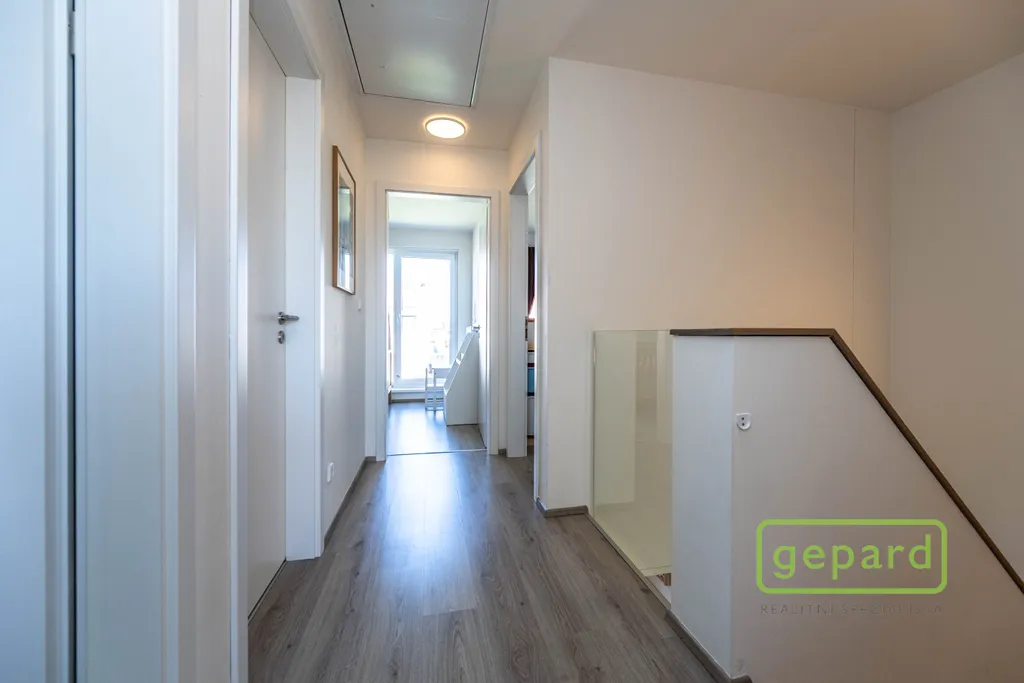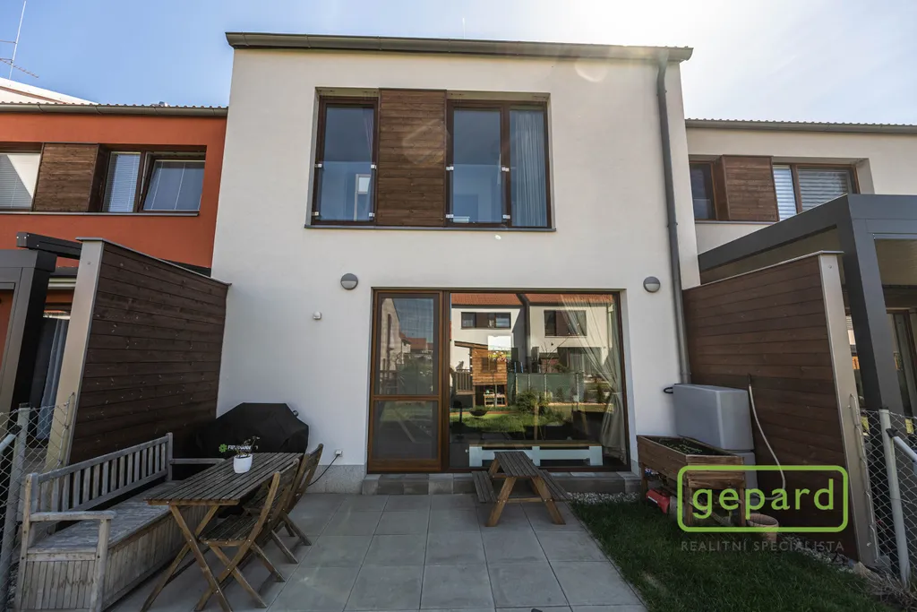 V přízemí je prostorný obývací pokoj s kuchyňským koutem (33,56 m2) a se vstupem na zahradu s terasou. Na zahradě je příprava pro umístění bazénu, zabudovaný stojan na velký slunečník a nádrž na dešťovou vodu, z které je vedená závlaha k záhonům. Kuchyňská linka je kompletně vybavená spotřebiči (myčka, trouba, mikrovlnná trouba, indukční varná deska, digestoř, kombinovaná lednice s mrazákem). Dál je v přízemí samostatné WC (1,98 m2), technická místnost (4,1 m2) s místem pro kotel, pračku a sušičku a spíž (2,47 m2). V patře jsou 3 ložnice (12,62, 10,24 a 9,02 m2), koupelna s vanou i sprchovým koutem (8,14 m2) a šatna (3,36 m2) vybavená policovým systémem. V podkroví je možné využít další úložný prostor. Před domem je místo pro parkování 2 automobilů. V ceně domu je kvalitní na míru vyrobený vestavěný nábytek v chodbě, jídelní části a hlavní ložnici, sítě proti hmyzu, rolety, závěsy a osvětlení. Ostatní vybavení dle dohody.
