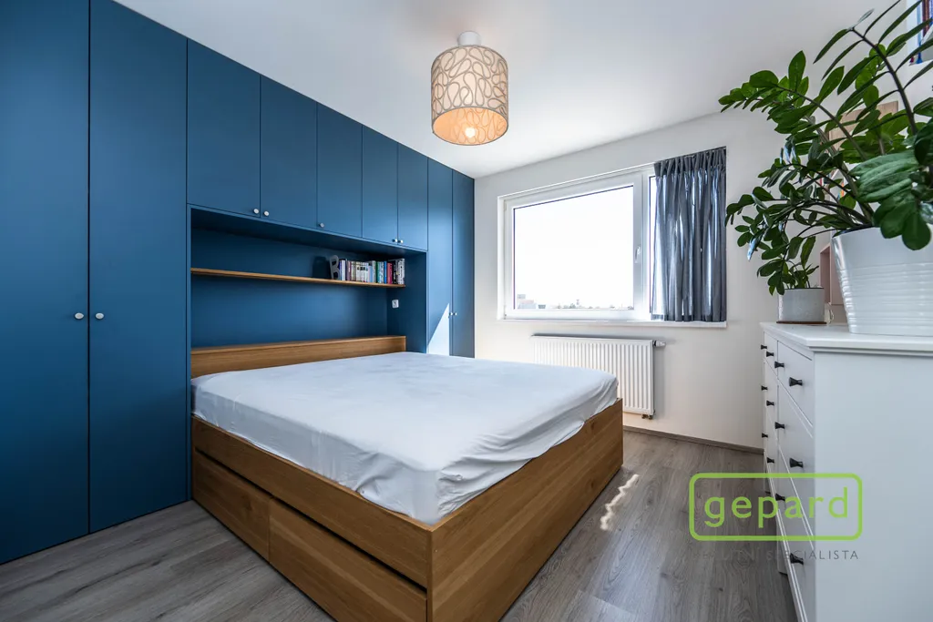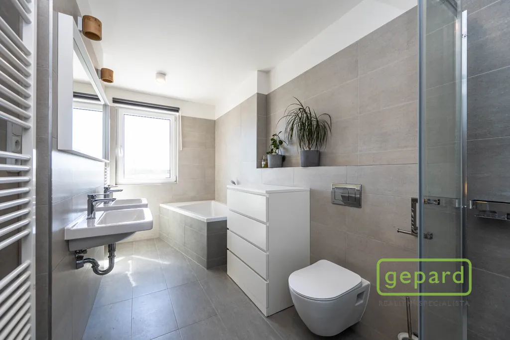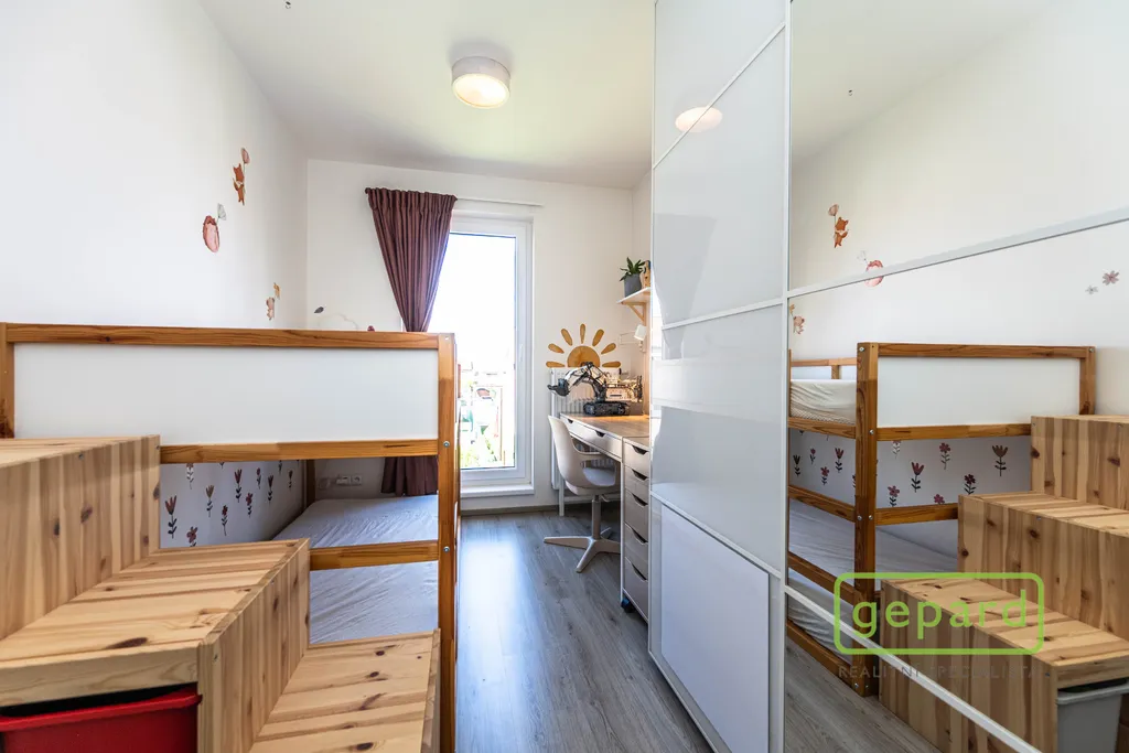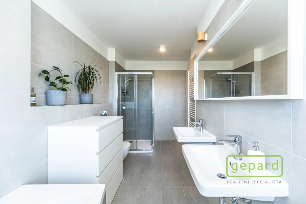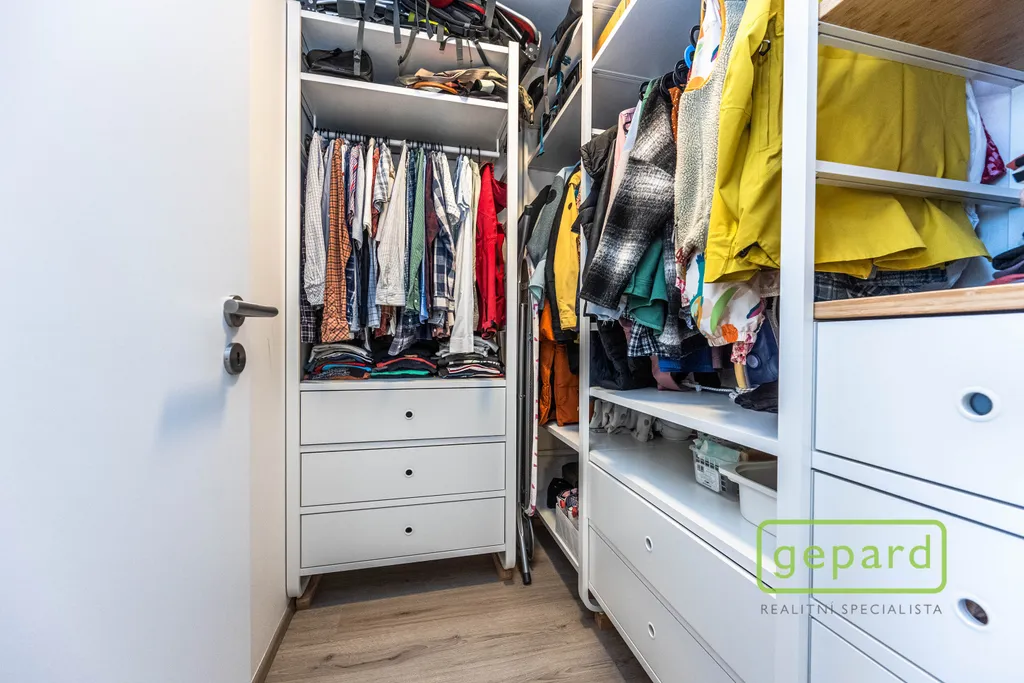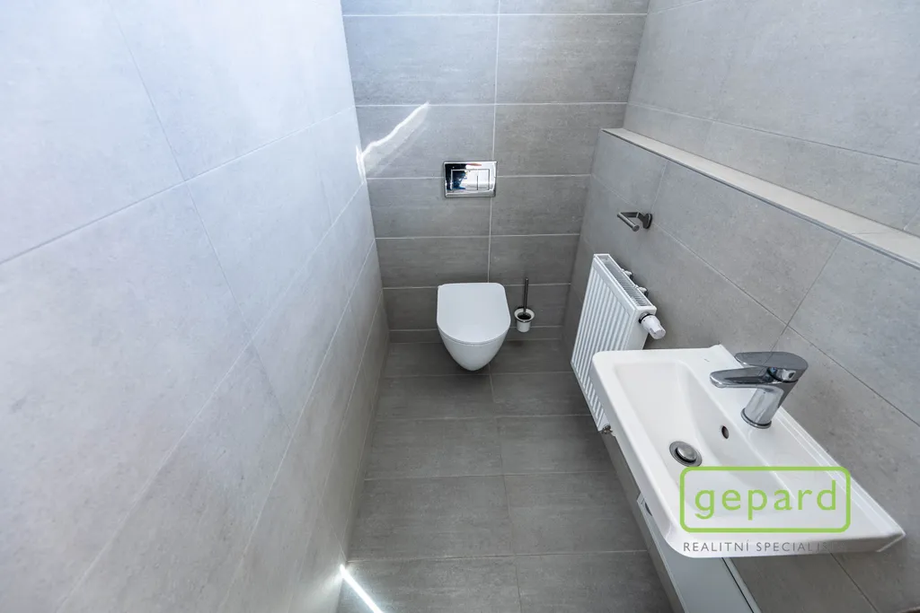 V přízemí je prostorný obývací pokoj s kuchyňským koutem (33,56 m2) a se vstupem na zahradu s terasou. Na zahradě je příprava pro umístění bazénu, zabudovaný stojan na velký slunečník a nádrž na dešťovou vodu, z které je vedená závlaha k záhonům. Kuchyňská linka je kompletně vybavená spotřebiči (myčka, trouba, mikrovlnná trouba, indukční varná deska, digestoř, kombinovaná lednice s mrazákem). Dál je v přízemí samostatné WC (1,98 m2), technická místnost (4,1 m2) s místem pro kotel, pračku a sušičku a spíž (2,47 m2). V patře jsou 3 ložnice (12,62, 10,24 a 9,02 m2), koupelna s vanou i sprchovým koutem (8,14 m2) a šatna (3,36 m2) vybavená policovým systémem. V podkroví je možné využít další úložný prostor. Před domem je místo pro parkování 2 automobilů. V ceně domu je kvalitní na míru vyrobený vestavěný nábytek v chodbě, jídelní části a hlavní ložnici, sítě proti hmyzu, rolety, závěsy a osvětlení. Ostatní vybavení dle dohody.