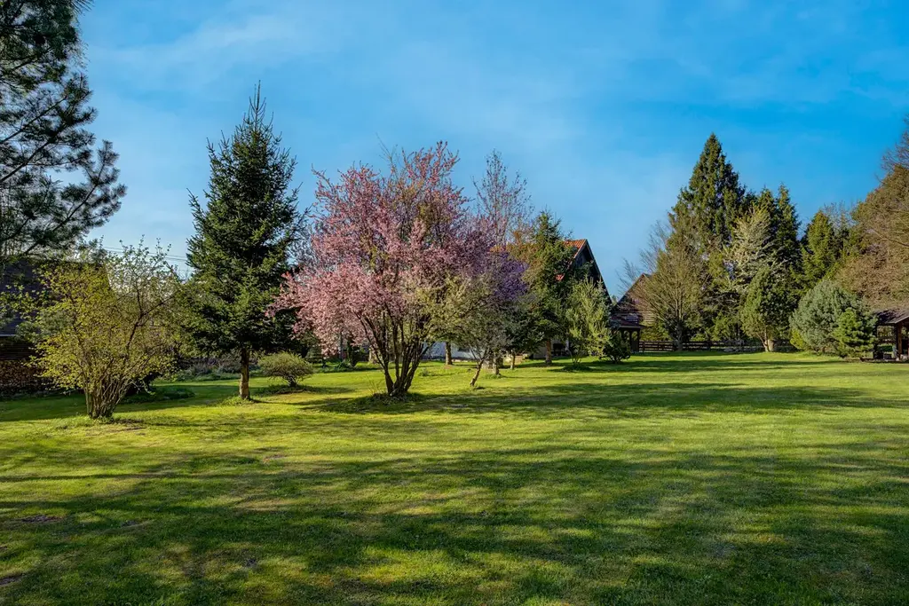 Zahrada je skoro rovinná, jsou zde vzrostlé okrasné keře a stromy, zahradní jezírko, kryté venkovní posezení a přístřešek na auto. Zahradní domek slouží k letnímu využití pro hosty nebo v zimě na uskladnění zahradního nábytku a nářadí.