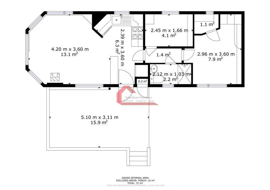 Mobilheim má obytnou plochu 53 m² a je doplněn o zastřešenou terasu o výměře 16 m². Dispozice 3+kk nabízí obývací část s kuchyní a dvě samostatné ložnice. Vytápění zajišťují krbová kamna, klimatizace s funkcí vytápění a přímotopy.