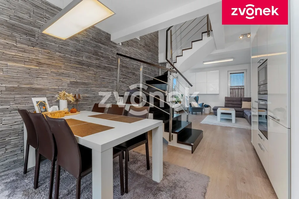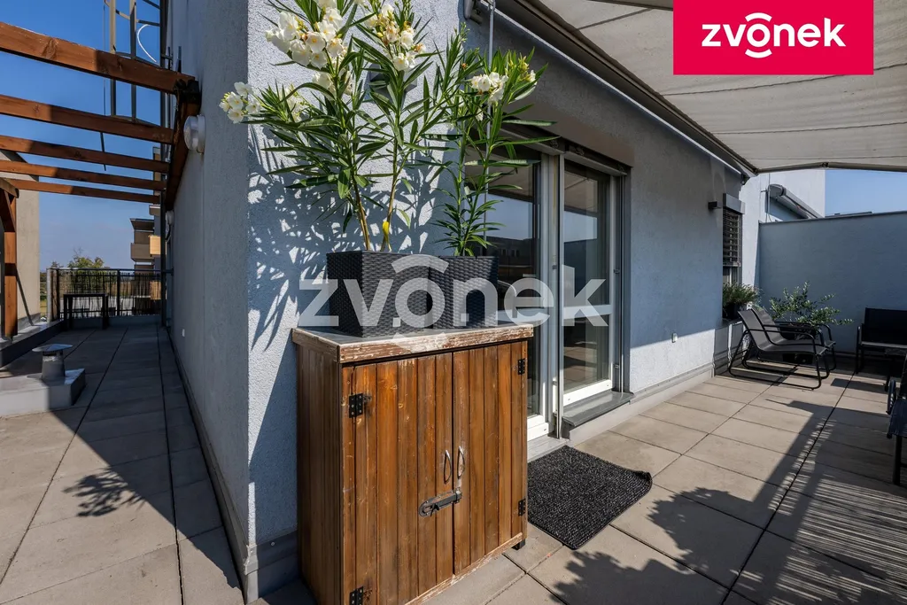 Dispozice bytu: zádveří s vestavěnými šatními skříněmi a vstupem na samostatné WC a do šatny s velkým množstvím úložných prostor. Obývací pokoj s jídelnou a kuchyní se vstupem na terasu a schodištěm do horní části bytu. Kuchyň je plně vybavena vestavěnými značkovými spotřebiči / elektrická trouba, mikrovlnná trouba, myčka na nádobí, lednice s mrazákem, digestoř|/ díky důmyslnému a promyšlenému řešení kuchyň nabízí velké množství úložných prostor jako je např. potravinová skříň s drátěným programem atd. Na rohové terase o ploše 37 m2 se nachází markýza, zahradní posezení, dětský koutek. V jídelně je umístěn velký jídelní stůl se židlemi. Stěna v jídelně a na schodišti je obložena přírodním kamenem. Z obývacího pokoje je vstup do horní části bytu schodištěm s nerezovým zábradlím. V horní části bytu se nachází chodba opět s vestavěnými skříněmi, se vstupem do ložnice se šatnou nabízející velké množství úložných prostor, dětského pokoje a koupelny se sprchovým koutem, společným WC a šatny s úložnými prostory. Všechny pokoje a místnosti jsou vybaveny na zakázku vyrobeným značkovým nábytkem a skříněmi, tyto jsou součástí ceny bytu. Ve všech oknech jsou umístěny elektricky ovládané venkovní protisluneční žaluzie. Byt je ve velmi udržovaném stavu odpovídající téměř novostavbě. K bytu náleží prostorná sklepní kóje o ploše 33,5 m2. Byt se nachází ve velmi klidné části bytové zástavby v lokalitě Kasárna. V blízkosti bytu se nachází, obchodní centrum, městské sportoviště, cyklostezka, dětské hřiště, škola, školka, aqua park, zimní stadion. Centrum města je vzdáleno do 8 min. pohodlnou chůzí. V bezprostřední blízkosti bytového domu je dostatek parkovacích míst. Byt je volný ihned.