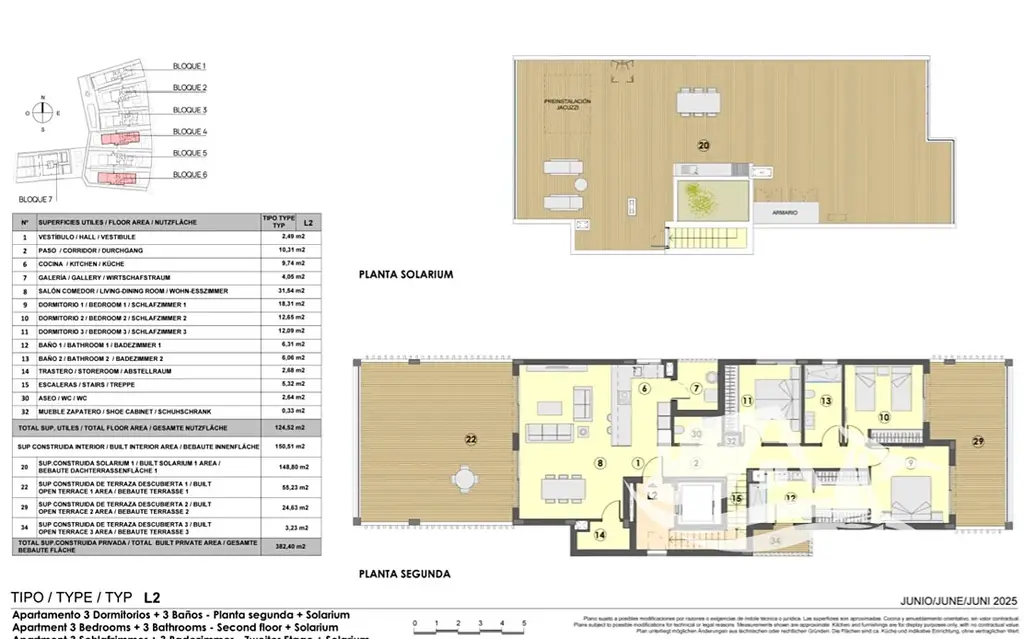 Apartmán dispozice 4+kk ve druhém patře nabízí celkovou plochu 382 m², přičemž užitná plocha činí 124,52 m². Dispozice je navržena s důrazem na otevřenost a maximální využití světla, kdy obytný prostor s kuchyní tvoří přirozené centrum bytu a plynule navazuje na venkovní části. Terasa o velikosti 55,23 m² a balkon o rozloze 24,63 m² vytvářejí ideální zázemí pro každodenní život i relaxaci.
