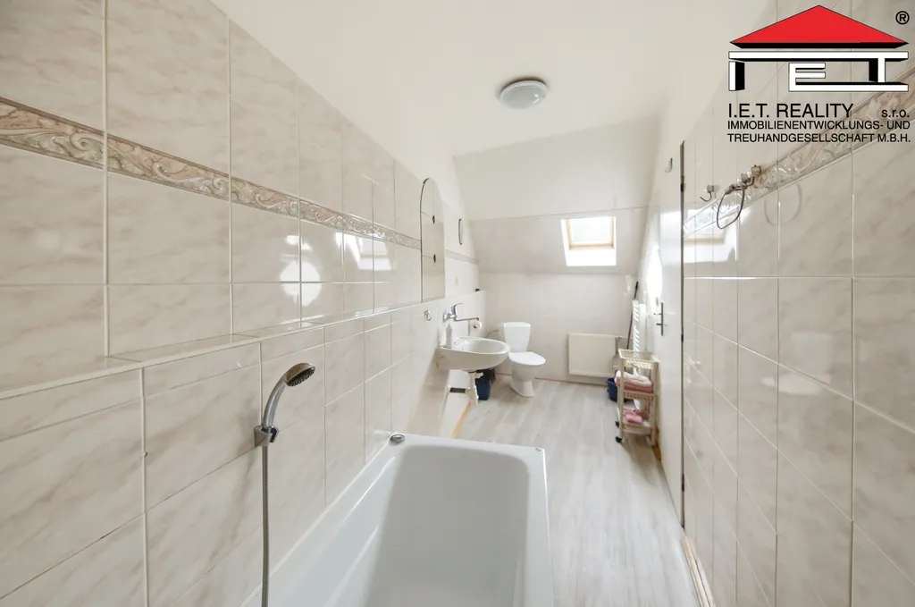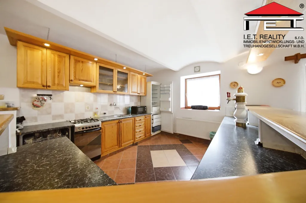 V Druhém domě se nachází plně vybavená kuchyně s barem, která je volně spojena s prostornou jídelnou (76 m2), gaučem a francouzskými dveřmi do zahrady, WC a koupelna se sprchovým koutem a infrasaunou. V prvním patře jsou tři pokoje, koupelna s rohovou vanou a WC.
