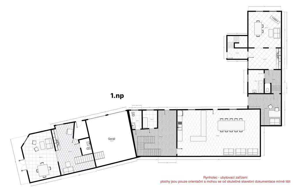 Mezi prvním a druhým domem se nachází garáž s dvěmi vjezdy o celkové výměře cca 40 m2.