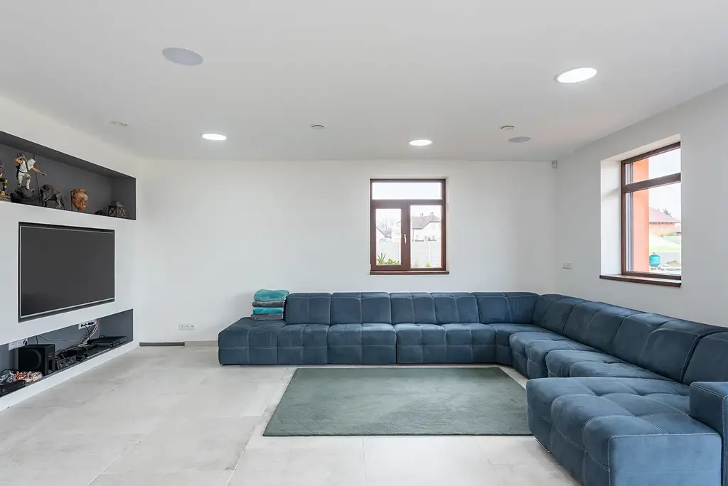 Hlavní dům je řešen jako bezbariérový bungalov, který poskytuje komfortní zázemí pro celou rodinu i případné dvougenerační bydlení. Dispozice zahrnuje čtyři ložnice, dvě pracovny, čtyři koupelny, šatnu a dvě samostatná WC. Dominantou je velkorysý obývací prostor o výměře 88 m² s kuchyní Bauformat ve vysokém lesku a impozantním ostrůvkem o velikosti 1,2 × 3,7 m, vybavený spotřebiči Siemens a Miele. Horní podlaží je koncipováno jako společenská a relaxační zóna s fitness a profesionálním domácím kinem s akustickou úpravou.