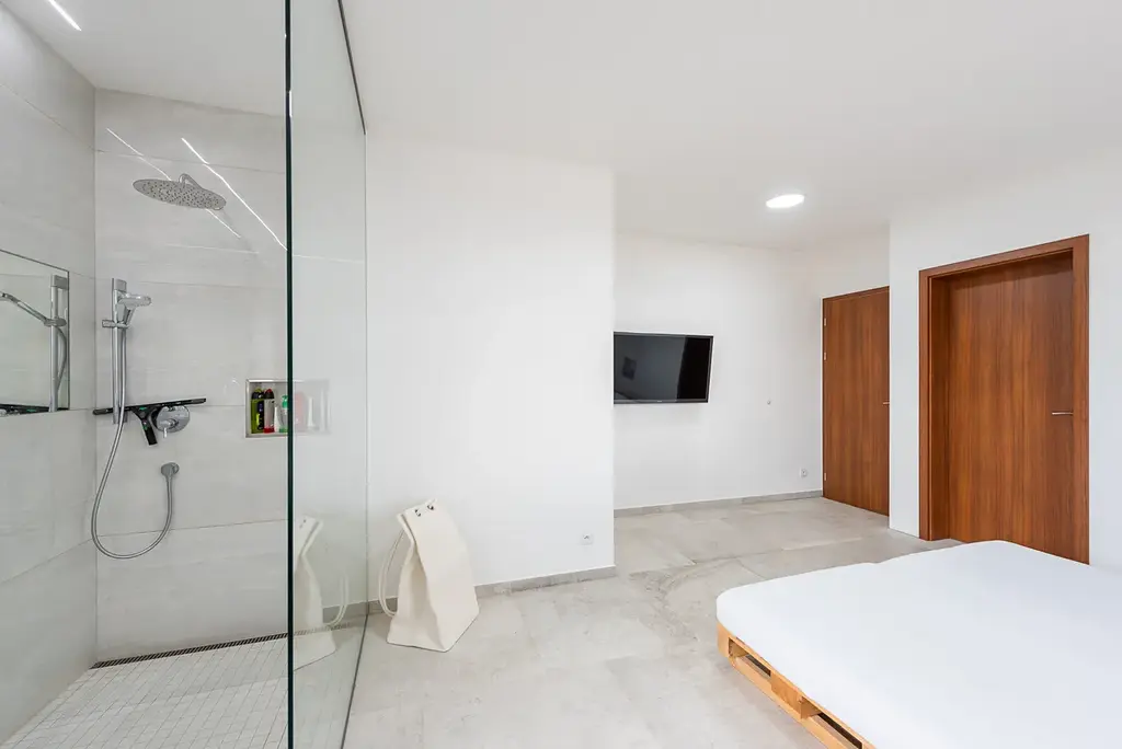 Interiér je vybaven prémiovými materiály – sanitou Catalano, bateriemi Hansgrohe a velkoformátovými obklady Rex by Florim Group. Podlahy v dekoru La Roche a koupelna s obklady Onyx Alabastro podtrhují celkový luxusní charakter nemovitosti.