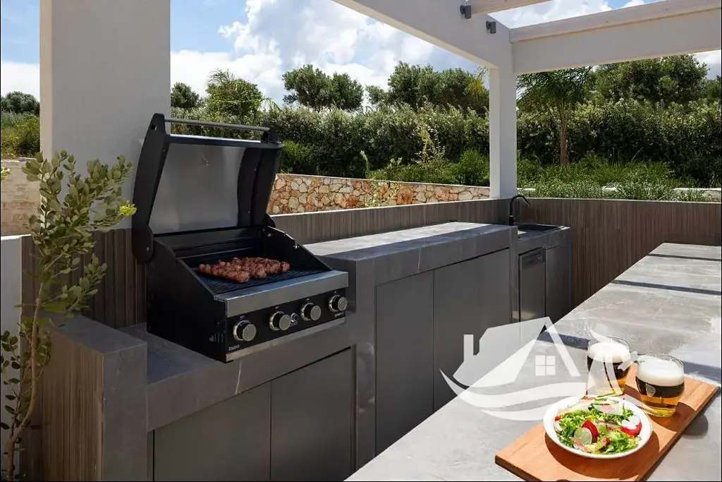 Díky vyvýšené poloze nabízí vila úchvatné panoramatické výhledy na Krétské moře i okolní hory. Dominantou exteriéru je prostorná terasa s privátním infinity bazénem, který opticky splývá s horizontem. Venkovní část je navržena pro pohodlný středomořský životní styl a zahrnuje kryté venkovní posezení, plně vybavenou letní kuchyni s BBQ, dřezem a pracovní plochou, venkovní sprchu a relaxační zónu se slunečníky a lehátky.