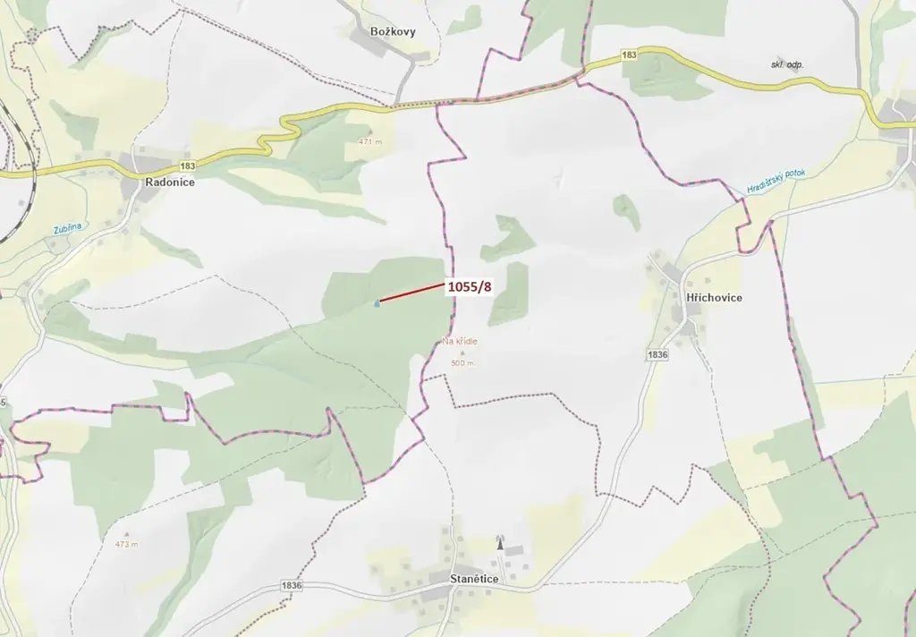 Lesní pozemek o výměře 546 m2, parcelní číslo 1055/8, podíl 1/1, katastrální území Radonice u Milavčí, obec Milavče, obec s rozšířenou působností Domažlice, okres Domažlice, Plzeňský kraj. Po těžbě.