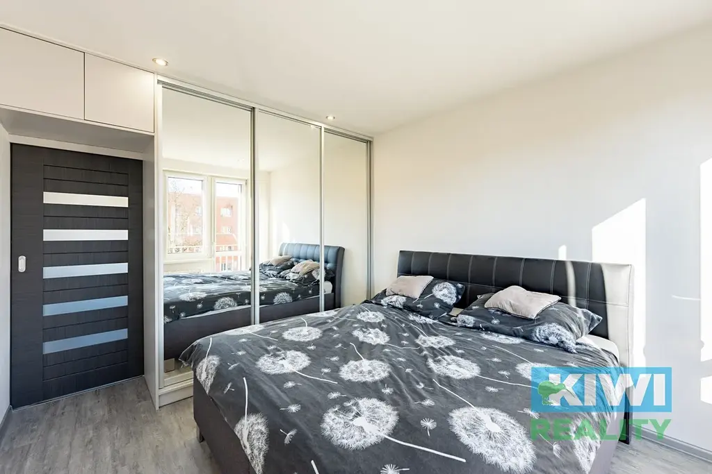 Byt nabízí promyšlené úložné prostory – vestavěné skříně na míru elegantně oddělují obývací pokoj od ložnice a zároveň poskytují dostatek místa pro uložení věcí bez nutnosti dalších skříní.