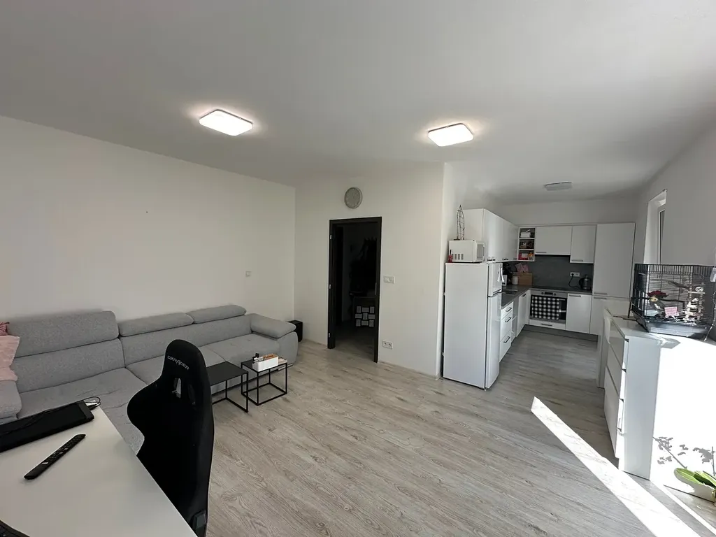 Byt je koncipován jako 2+kk o výměře 50m2 se dvěma balkony. Plocha balkonů v tomto bytě činí 18m2 nad rámec plochy vnitřních prostor. Celkem se tedy jedná o 68m2 obytné plochy vč. balkonů. Každá místnost má vstup na svůj balkon. V celém bytě jsou plovoucí podlahy a protihluková okna. Topení je podlahové, ohřev vody el. bojlerem. Byt je velmi ekonomický i díky nadstandardnímu zateplení budovy. Byt je orientovaný na jih. K bytu náleží sklepní kóje a kryté parkovací stání pro 1 auto. Kryté parkovací stání je již v ceně nájmu.