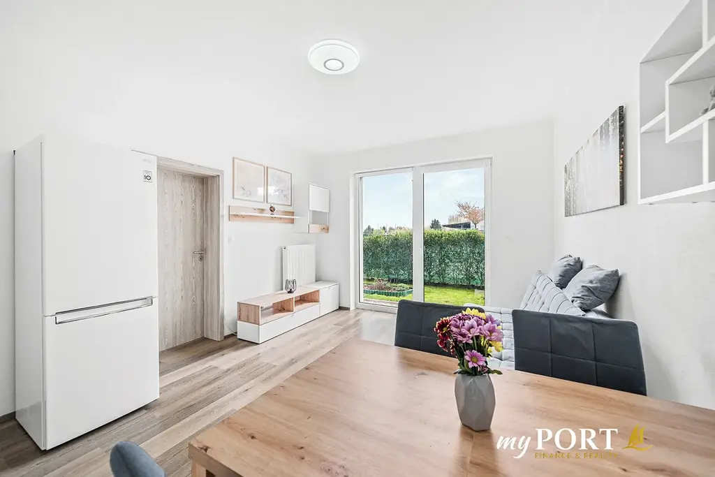 • Obývací pokoj s kuchyňským koutem a s přímým vstupem na předzahrádku.