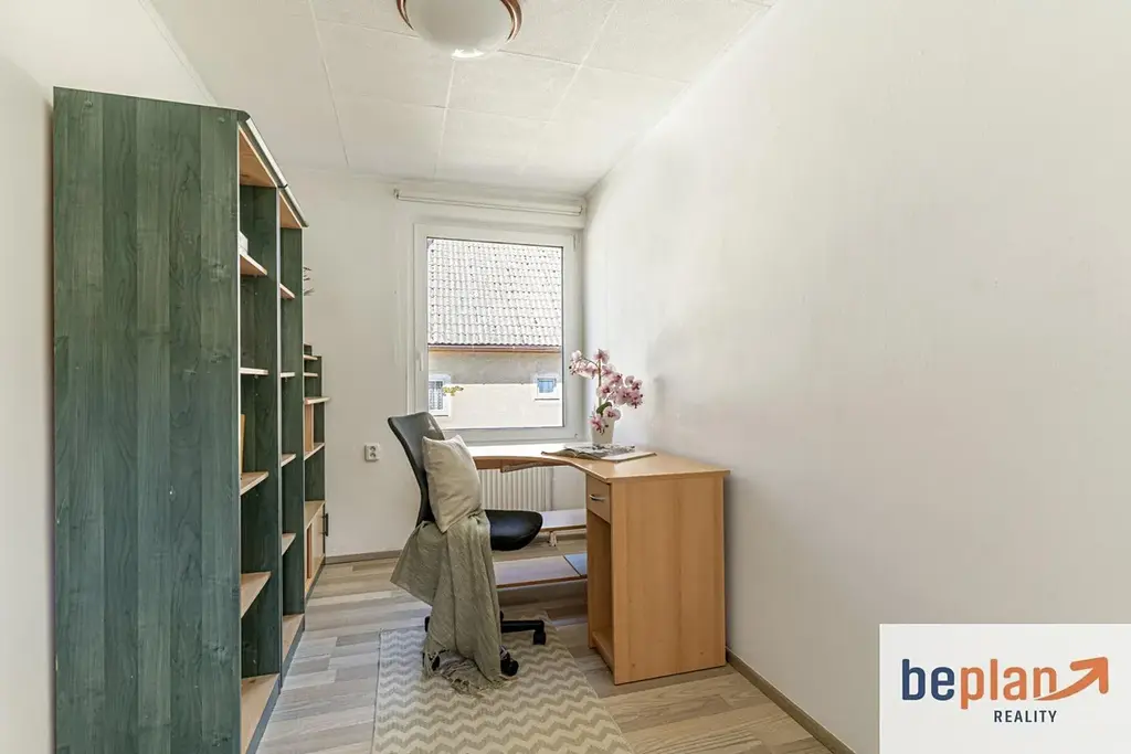Dispozice domu je praktická a vzdušná. Ve zvýšeném přízemí se nachází otevřený obytný prostor s kuchyní a jídelnou, který tvoří přirozené srdce domova. Odtud vedou dřevěné schody do patra, kde najdete tři samostatné pokoje, koupelnu s vanou a oddělené WC. Podsklepení nabízí technické zázemí i dostatek úložných prostor.